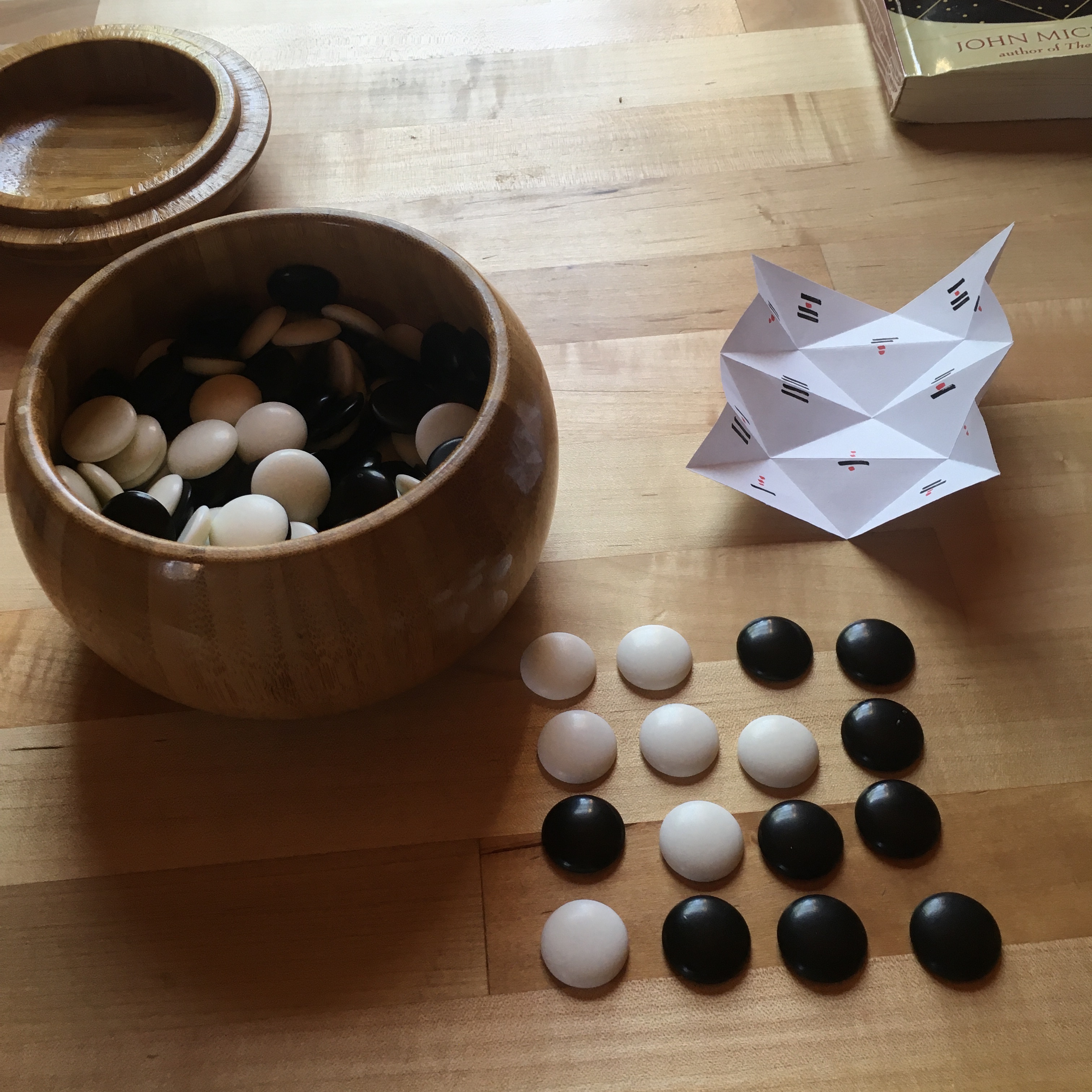 - your geomancy setup is really elegant (go disks?). For Yijing, I've started using colored beads in a proportion that mimics the yarrow-stick method but I hadn't thought through the necessary math to figure something out for this system. I weight elemental balance as equal to both imbalanced states, so it looks like a tripartite relationship (though technically, it's reflecting alternating states of balance like so: balance - excess quality - balance - deficient quality). I'm not sure a quantity of tokens could achieve the direct outcome of something like "excess Fire of Earth".